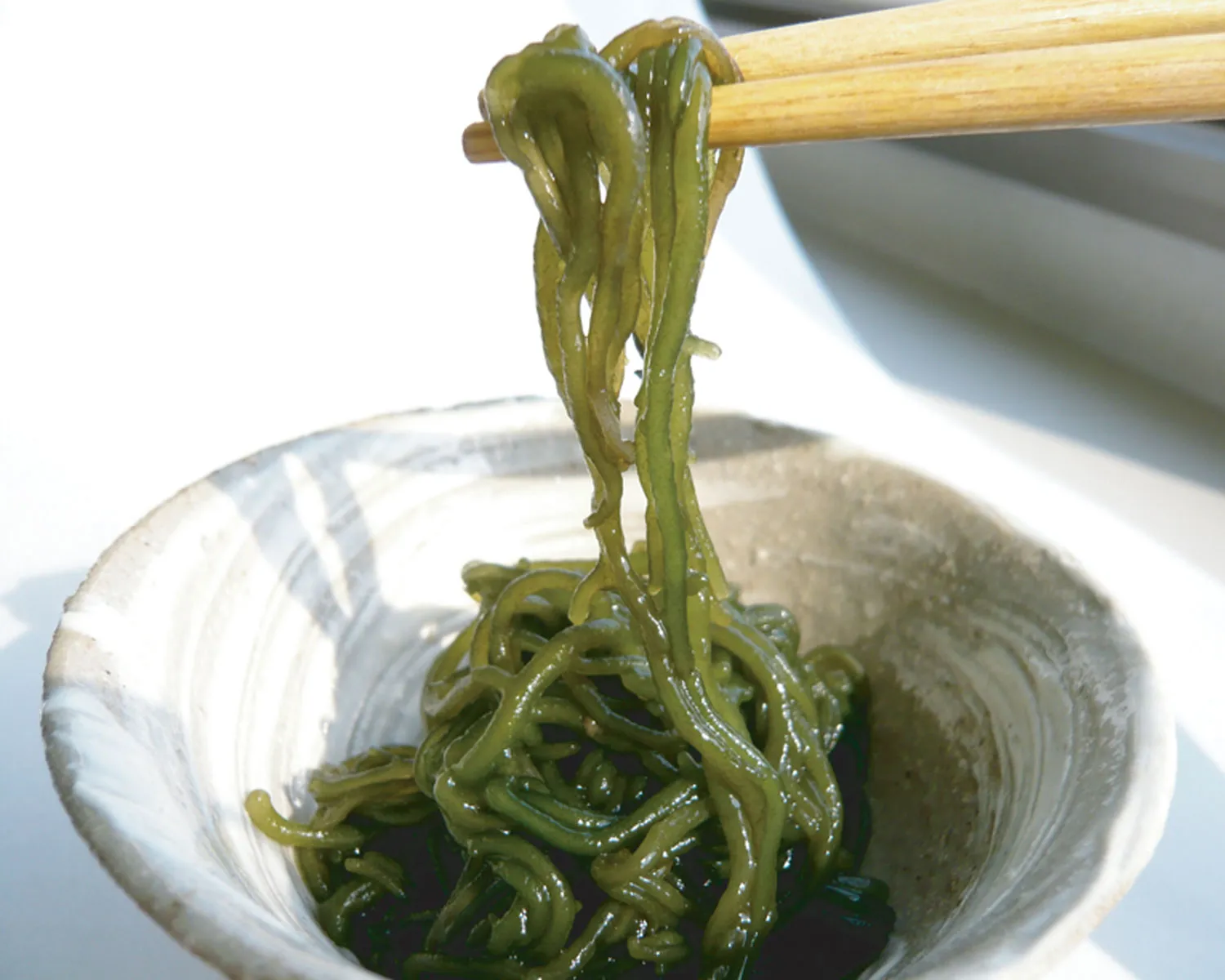 一般的なもずくよりも太く、しっかりとした歯ごたえとつるりとした食感が特徴です。