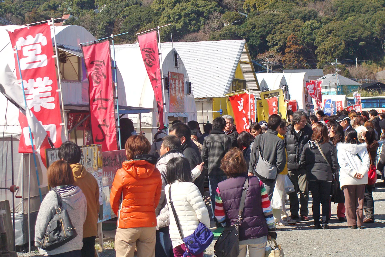 漁港周辺にはカキ小屋が立ち並び、冬になると多くの人が焼きカキを楽しみに訪れます。